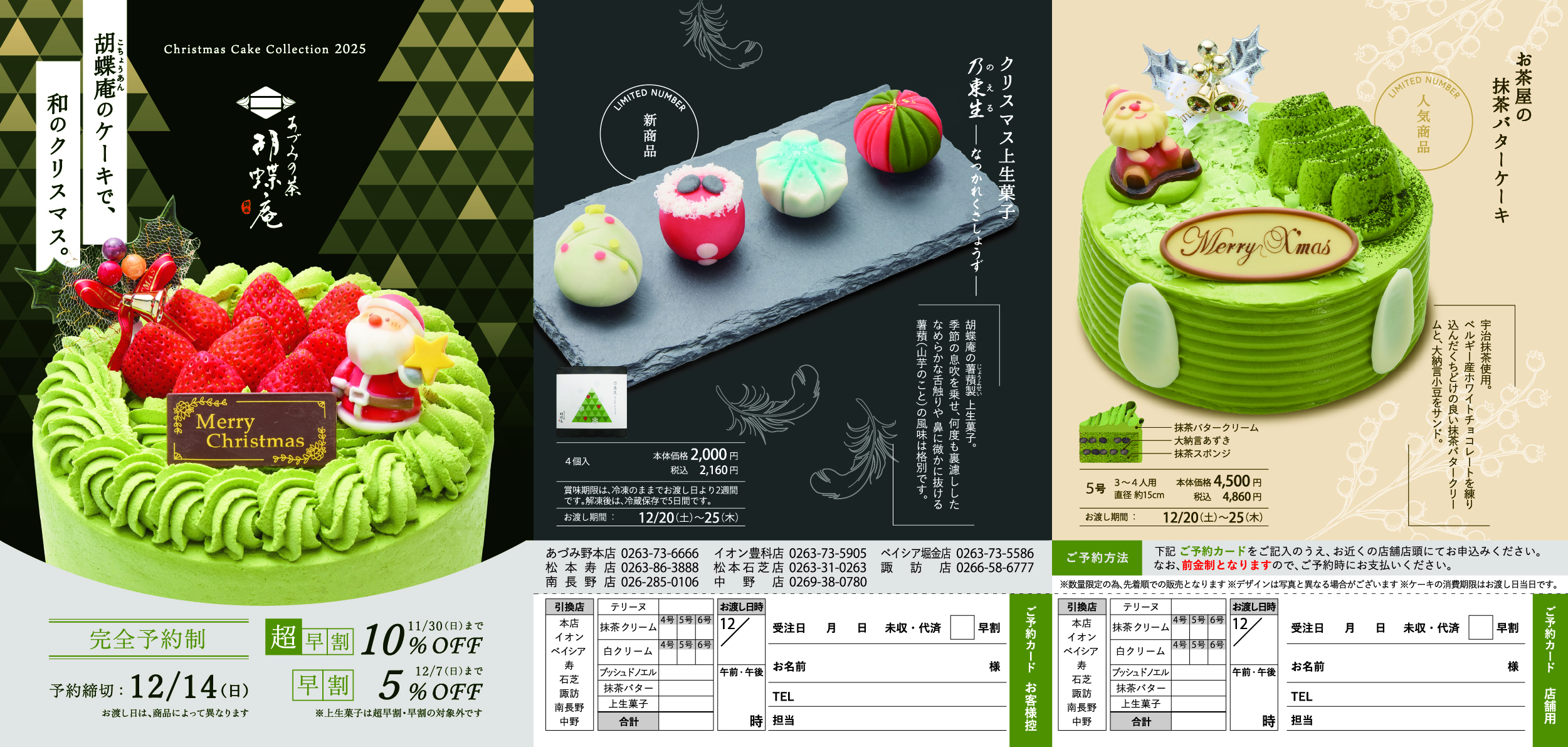 抹茶ケーキやテリーヌ、上生菓子など、和素材の美味しさをいかした「胡蝶庵のクリスマスケーキ」。
