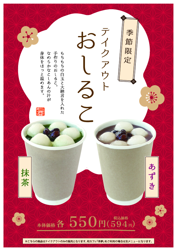 茶夢併設店舗限定で、冬のテイクアウトメニューとして あったか和スイーツ「おしるこ」の販売を開始しました!