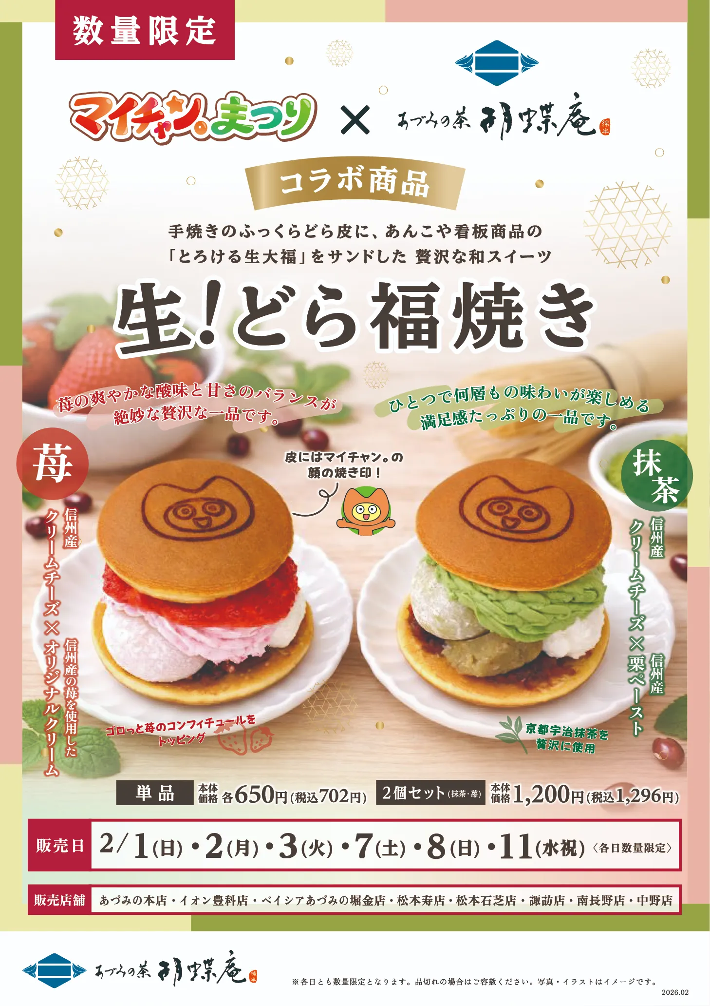 【数量限定】マイチャン。まつりとのコラボスイーツ「生!どら福焼き」を店舗でも販売します! - あづみの茶 胡蝶庵